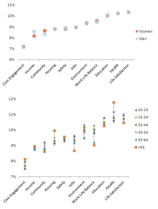 And as it turns out, it is not true that “Men are from Mars, Women are from Venus” — in fact when it comes to the really important things in life, men and women see things in pretty much the same way. For a wide range of issues such as life satisfaction, work-life balance, environment, jobs or housing, there is little or no difference in the importance you attach to them whether you are a man or woman. It turns out, though, that women care slightly less about income (might that somehow be connected with the fact that on average in OECD countries women still earn 16% less than men?), and more about their health and having a good social support network.