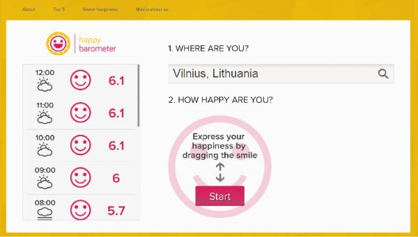 Launched in July this year, the Happy Barometer invites people to rate their happiness level on a zero-to-ten scale on an hourly basis, as well as specify their location in the world. The Happy Barometer idea is based on a few simple assumptions: first of all, people’s moods change more often than once per year, so they should be measured constantly. People’s level of happiness also depends on where they live. In each country you will find more or less attractive places, which is why we measure happiness at city, not national, level. The last assumption is that only individuals can tell how happy they are. So the best way to know is to ask them.